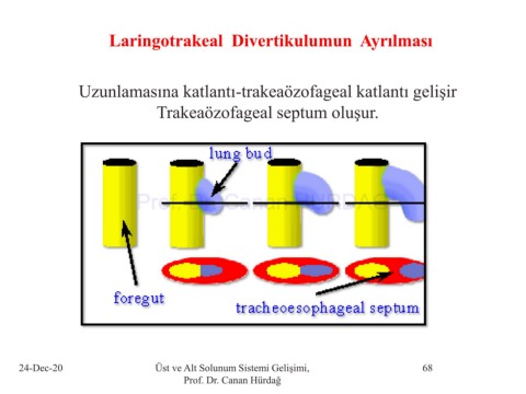 Laringotrakeal Divertikulumun Ayrılması Uzunlamasına katlantı-trakeaözofageal katlantı gelişir Trakeaözofageal septum oluşur. Prof. Dr. Canan HURDAG 24-Dec-20 Üst ve Alt Solunum Sistemi Gelişimi, 68 Prof. Dr. Canan Hürdağ