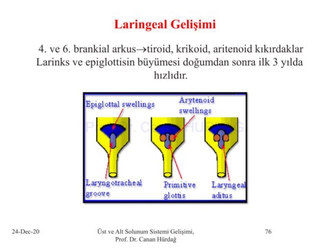 Laringeal Gelişimi 4. ve 6. brankial arkus→tiroid, krikoid, aritenoid kıkırdaklar Larinks ve epiglottisin büyümesi doğumdan sonra ilk 3 yılda hızlıdır. Prof. Dr. Canan HURDAG 24-Dec-20 Üst ve Alt Solunum Sistemi Gelişimi, 76 Prof. Dr. Canan Hürdağ