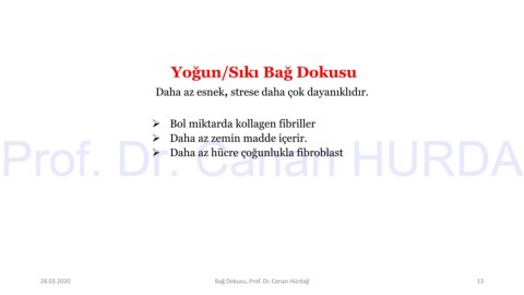 Yoğun/Sıkı Bağ Dokusu Daha az esnek, strese daha çok dayanıklıdır. ➢ Bol miktarda kollagen fibriller ➢ Daha az zemin madde içerir. Prof. Dr. Canan HURDA ➢ Daha az hücre çoğunlukla fibroblast 28.03.2020 Bağ Dokusu, Prof. Dr. Canan Hürdağ 13