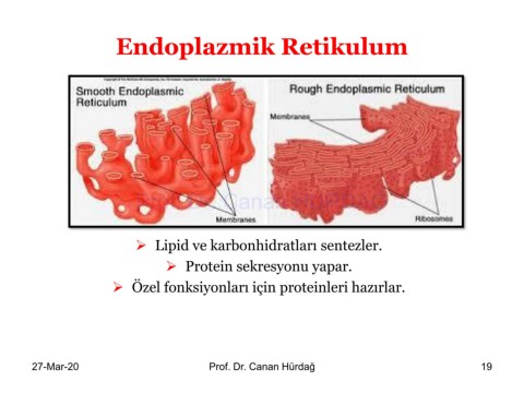 Endoplazmik Retikulum Prof. Dr. Canan HURDAG ➢ Lipid ve karbonhidratları sentezler. ➢ Protein sekresyonu yapar. ➢ Özel fonksiyonları için proteinleri hazırlar. 27-Mar-20 Prof. Dr. Canan Hürdağ 19