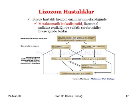 Lizozom Hastalıklar ✓ Birçok hastalık lizozom enzimlerinin eksikliğinde ✓ Metakromatik leukodistrofid, lizozomal sulfataz eksikliğinde sulfatlı serebrosidler hücre içinde birikir. Prof. Dr. Canan HURDAG 27-Mar-20 Prof. Dr. Canan Hürdağ 47