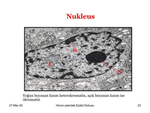 Nukleus H Prof. Dr. Canan HURDAG E N Yoğun boyanan kısım heterokromatin, açık boyanan kısım ise ökromatin 27-Mar-20 Hücre çekirdek.Epitel Dokusu 23