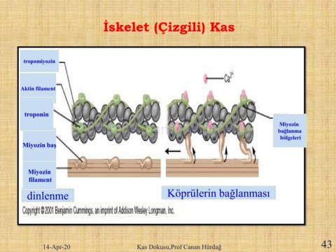 İskelet (Çizgili) Kas tropomiyozin Aktin filament troponin Miyozin Prof. Dr. Canan HURDAG bağlanma bölgeleri Miyozin baş Miyozin filament dinlenme Köprülerin bağlanması 43 14-Apr-20 Kas Dokusu,Prof Canan Hürdağ