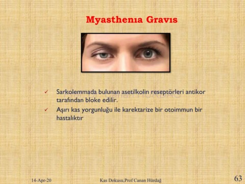Myasthenıa Gravıs ✓ Sarkolemmada bulunan asetilkolin reseptörleri antikor Prof. Dr. Canan HURDAG tarafından bloke edilir. ✓ Aşırı kas yorgunluğu ile karektarize bir otoimmun bir hastalıktır 63 14-Apr-20 Kas Dokusu,Prof Canan Hürdağ