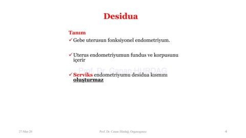 Desidua Tanım ✓Gebe uterusun fonksiyonel endometriyum. ✓Uterus endometriyumun fundus ve korpusunu içerir Prof. Dr. Canan HURDAG ✓Serviks endometriyumu desidua kısmını oluşturmaz 27-Mar-20 Prof. Dr. Canan Hürdağ, Organogenez 4