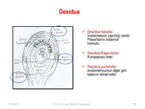 Desidua ✓ Desidua basalis: İmplantasyon yapıldığı yerdir. Plasentanın maternal kısmıdır. ✓ Desidua Kapsularis: Konseptusu örter. ✓ Desidua parietalis: endometriyumun diğer geri kalanını temsil eder. 3/22/2022 Prof. Dr. Canan Hürdağ, Organogenez 106