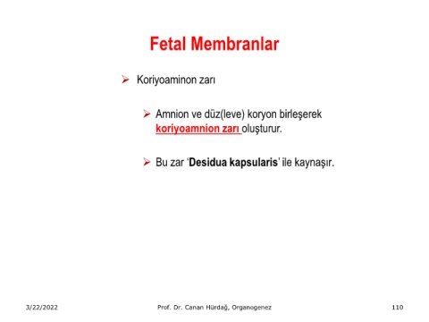 Fetal Membranlar ➢ Koriyoaminon zarı ➢ Amnion ve düz(leve) koryon birleşerek koriyoamnion zarı oluşturur. ➢ Bu zar ‘Desidua kapsularis’ ile kaynaşır. 3/22/2022 Prof. Dr. Canan Hürdağ, Organogenez 110