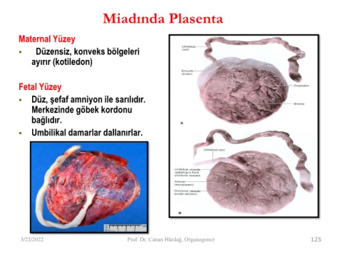 Miadında Plasenta Maternal Yüzey ▪ Düzensiz, konveks bölgeleri ayırır (kotiledon) Fetal Yüzey ▪ Düz, şefaf amniyon ile sarılıdır. Merkezinde göbek kordonu bağlıdır. ▪ Umbilikal damarlar dallanırlar. 3/22/2022 Prof. Dr. Canan Hürdağ, Organogenez 125