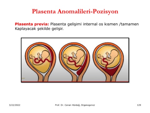 Plasenta Anomalileri-Pozisyon Plasenta previa: Plasenta gelişimi internal os kısmen /tamamen Kaplayacak şekilde gelişir. 3/22/2022 Prof. Dr. Canan Hürdağ, Organogenez 129
