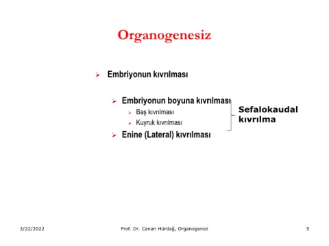 Organogenesiz ➢ Embriyonun kıvrılması ➢ Embriyonun boyuna kıvrılması ➢ Baş kıvrılması Sefalokaudal ➢ Kuyruk kıvrılması kıvrılma ➢ Enine (Lateral) kıvrılması 3/22/2022 Prof. Dr. Canan Hürdağ, Organogenez 5