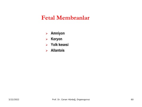 Fetal Membranlar ➢ Amniyon ➢ Koryon ➢ Yolk kesesi ➢ Allantois 3/22/2022 Prof. Dr. Canan Hürdağ, Organogenez 60