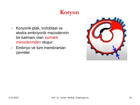 Koryon ✓ Koryonik plak, trofoblast ve ekstra embriyonik mezodermin bir katmanı olan somatik mezodermden oluşur. ✓ Embriyo ve tüm membranları çevreler. 3/22/2022 Prof. Dr. Canan Hürdağ, Organogenez 70