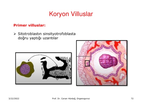 Koryon Villuslar Primer villuslar: ➢ Sitotroblastın sinsityotrofoblasta doğru yaptığı uzantılar 3/22/2022 Prof. Dr. Canan Hürdağ, Organogenez 72