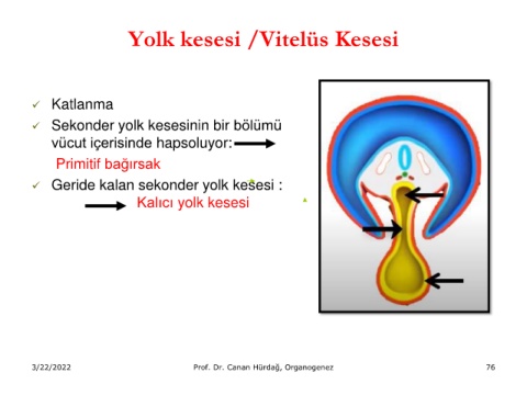 Yolk kesesi /Vitelüs Kesesi ✓ Katlanma ✓ Sekonder yolk kesesinin bir bölümü vücut içerisinde hapsoluyor: Primitif bağırsak ✓ Geride kalan sekonder yolk kesesi : Kalıcı yolk kesesi 3/22/2022 Prof. Dr. Canan Hürdağ, Organogenez 76