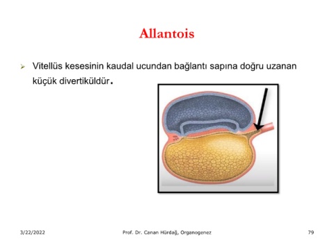 Allantois ➢ Vitellüs kesesinin kaudal ucundan bağlantı sapına doğru uzanan küçük divertiküldür. 3/22/2022 Prof. Dr. Canan Hürdağ, Organogenez 79