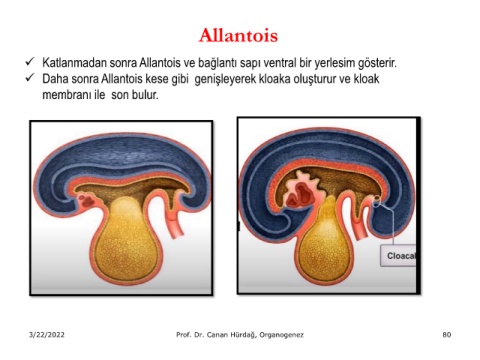 Allantois ✓ Katlanmadan sonra Allantois ve bağlantı sapı ventral bir yerlesim gösterir. ✓ Daha sonra Allantois kese gibi genişleyerek kloaka oluşturur ve kloak membranı ile son bulur. 3/22/2022 Prof. Dr. Canan Hürdağ, Organogenez 80