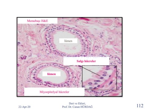 Memebaşı H&E lümen Prof. Dr. Canan HURDAG Salgı hücreler lümen Miyoepitelyal hücreler Deri ve Ekleri, 22-Apr-20 Prof. Dr. Canan HÜRDAĞ 112