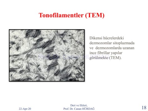 Tonofilamentler (TEM) Dikensi hücrelerdeki dezmozomlar sitoplazmada ve dezmozomlarda uzanan ince fibrillar yapılar Prof. Dr. Canan HURDAG görülmekte (TEM). Deri ve Ekleri, 22-Apr-20 Prof. Dr. Canan HÜRDAĞ 18