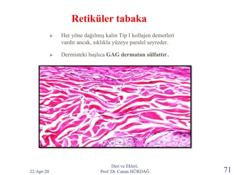 Retiküler tabaka ➢ Her yöne dağılmış kalın Tip I kollajen demetleri vardır ancak, sıklıkla yüzeye paralel seyreder. Dermisteki başlıca GAG dermatan sülfattır. ➢ Prof. Dr. Canan HURDAG Deri ve Ekleri, 22-Apr-20 Prof. Dr. Canan HÜRDAĞ 71