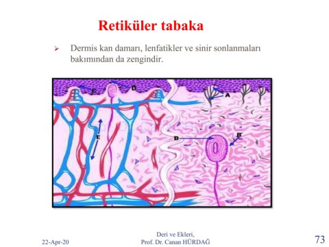 Retiküler tabaka ➢ Dermis kan damarı, lenfatikler ve sinir sonlanmaları bakımından da zengindir. Prof. Dr. Canan HURDAG Deri ve Ekleri, 22-Apr-20 Prof. Dr. Canan HÜRDAĞ 73