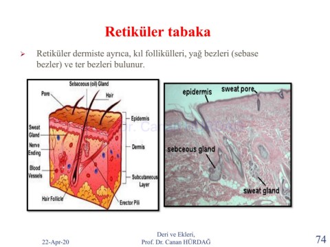 Retiküler tabaka ➢ Retiküler dermiste ayrıca, kıl follikülleri, yağ bezleri (sebase bezler) ve ter bezleri bulunur. Prof. Dr. Canan HURDAG Deri ve Ekleri, 22-Apr-20 Prof. Dr. Canan HÜRDAĞ 74