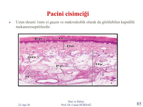Pacini cisimciği ➢ Uzun ekseni 1mm yi geçen ve makroskobik olarak da görülebilen kapsüllü mekanoreseptörlerdir. Prof. Dr. Canan HURDAG Deri ve Ekleri, 22-Apr-20 Prof. Dr. Canan HÜRDAĞ 85