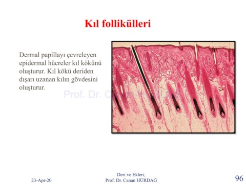 Kıl follikülleri Dermal papillayı çevreleyen epidermal hücreler kıl kökünü oluşturur. Kıl kökü deriden dışarı uzanan kılın gövdesini oluşturur. Prof. Dr. Canan HURDAG Deri ve Ekleri, 23-Apr-20 Prof. Dr. Canan HÜRDAĞ 96