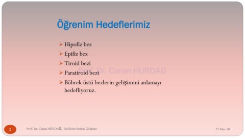 Öğrenim Hedeflerimiz ➢ Hipofiz bez ➢ Epifiz bez ➢ Tiroid bezi Prof. Dr. Canan HURDAG ➢ Paratiroid bezi ➢ Böbrek üstü bezlerin gelişimini anlamayı hedefliyoruz. 2 Prof. Dr. Canan HÜRDAĞ, Endokrin Sistem Gelişimi 27-Mar-20