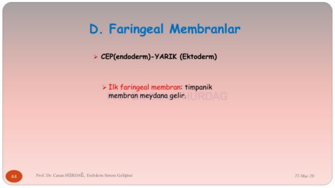 D. Faringeal Membranlar ➢ CEP(endoderm)-YARIK (Ektoderm) ➢ İlk faringeal membran: timpanik membran meydana gelir. Prof. Dr. Canan HURDAG 44 Prof. Dr. Canan HÜRDAĞ, Endokrin Sistem Gelişimi 27-Mar-20