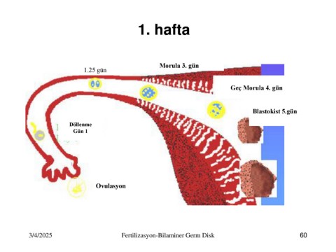 1. hafta Morula 3. gün 1.25 gün Geç Morula 4. gün Blastokist 5.gün Döllenme Gün 1 Ovulasyon 3/4/2025 Fertilizasyon-Bilaminer Germ Disk 60