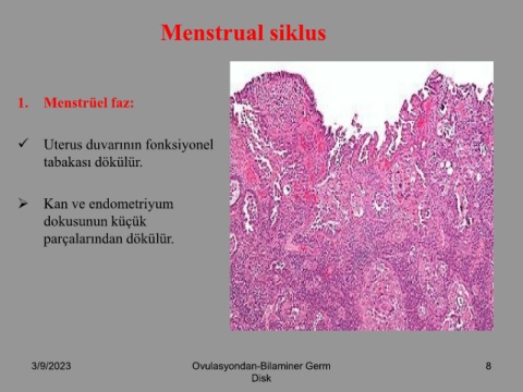 Menstrual siklus 1. Menstrüel faz: ✓ Uterus duvarının fonksiyonel tabakası dökülür. ➢ Kan ve endometriyum dokusunun küçük parçalarından dökülür. 3/9/2023 Ovulasyondan-Bilaminer Germ 8 Disk