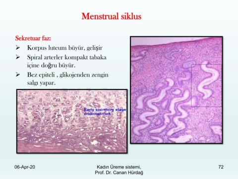 Menstrual siklus Sekretuar faz: ➢ Korpus luteum büyür, gelişir ➢ Spiral arterler kompakt tabaka içine doğru büyür. ➢ Bez epiteli , glikojenden zengin salgı yapar. Prof. Dr. Canan HURDAG 06-Apr-20 Kadın Üreme sistemi, 72 Prof. Dr. Canan Hürdağ