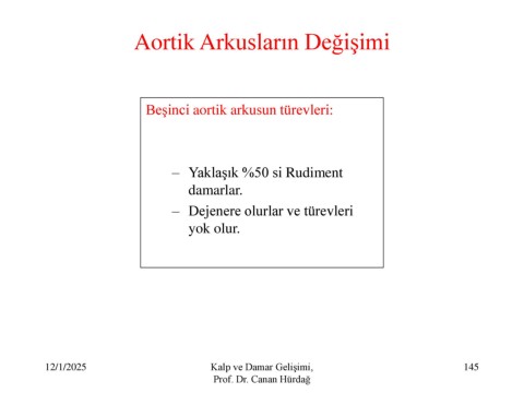 Aortik Arkusların Değişimi Beşinci aortik arkusun türevleri: – Yaklaşık %50 si Rudiment damarlar. – Dejenere olurlar ve türevleri yok olur. 12/1/2025 Kalp ve Damar Gelişimi, 145 Prof. Dr. Canan Hürdağ