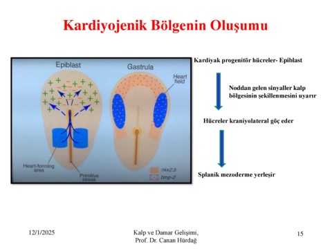 Kardiyojenik Bölgenin Oluşumu Kardiyak progenitör hücreler- Epiblast Noddan gelen sinyaller kalp bölgesinin şekillenmesini uyarır Hücreler kraniyolateral göç eder Splanik mezoderme yerleşir 12/1/2025 Kalp ve Damar Gelişimi, 15 Prof. Dr. Canan Hürdağ