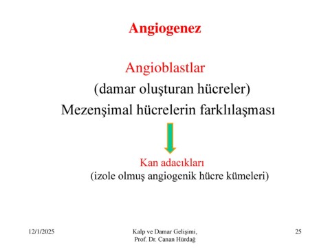 Angiogenez Angioblastlar (damar oluşturan hücreler) Mezenşimal hücrelerin farklılaşması Kan adacıkları (izole olmuş angiogenik hücre kümeleri) 12/1/2025 Kalp ve Damar Gelişimi, 25 Prof. Dr. Canan Hürdağ