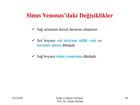 Sinus Venosus’daki Değişiklikler ✓ Sağ atriumun dorsal duvarını oluşturur. ✓ Sol boynuz sol atriyum oblik veni ve koroner sinuse dönüşür. ✓ Sağ boynuz sinus venaruma dönüşür. 12/1/2025 Kalp ve Damar Gelişimi, 66 Prof. Dr. Canan Hürdağ