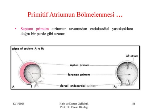 Primitif Atriumun Bölmelenmesi ... • Septum primum atriumun tavanından endokardial yastıkçıklara doğru bir perde gibi uzanır. 12/1/2025 Kalp ve Damar Gelişimi, 81 Prof. Dr. Canan Hürdağ