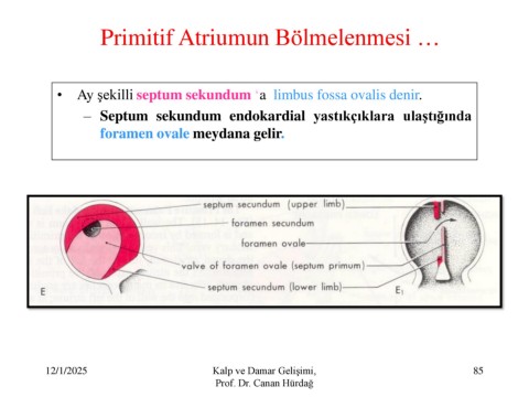 Primitif Atriumun Bölmelenmesi … • Ay şekilli septum sekundum ‘a limbus fossa ovalis denir. – Septum sekundum endokardial yastıkçıklara ulaştığında foramen ovale meydana gelir. 12/1/2025 Kalp ve Damar Gelişimi, 85 Prof. Dr. Canan Hürdağ