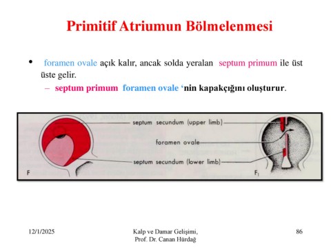 Primitif Atriumun Bölmelenmesi • foramen ovale açık kalır, ancak solda yeralan septum primum ile üst üste gelir. – septum primum foramen ovale ‘nin kapakçığını oluşturur. 12/1/2025 Kalp ve Damar Gelişimi, 86 Prof. Dr. Canan Hürdağ