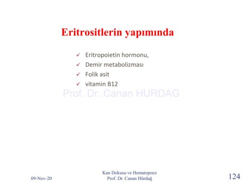 Eritrositlerin yapımında ✓ Eritropoietin hormonu, ✓ Demir metabolizması ✓ Folik asit ✓ vitamin B12 Prof. Dr. Canan HURDAG Kan Dokusu ve Hematopoez 09-Nov-20 Prof. Dr. Canan Hürdağ 124