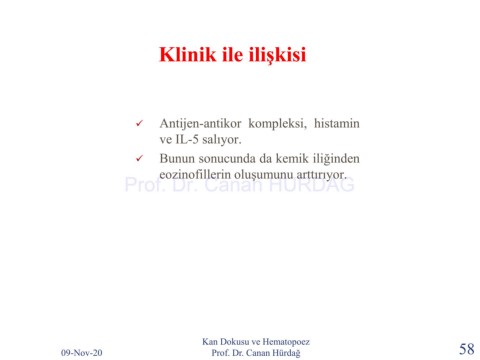 Klinik ile ilişkisi ✓ Antijen-antikor kompleksi, histamin ve IL-5 salıyor. ✓ Bunun sonucunda da kemik iliğinden eozinofillerin oluşumunu arttırıyor. Prof. Dr. Canan HURDAG Kan Dokusu ve Hematopoez 09-Nov-20 Prof. Dr. Canan Hürdağ 58