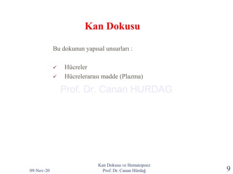 Kan Dokusu Bu dokunun yapısal unsurları : ✓ Hücreler ✓ Hücrelerarası madde (Plazma) Prof. Dr. Canan HURDAG Kan Dokusu ve Hematopoez 09-Nov-20 Prof. Dr. Canan Hürdağ 9