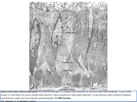İnsan trakeasının elektron mikrografı. Bu elektron mikrograf, bu solunum epitelyumunun üç ana hücre tipini göstermektedir. Yüzeye kadar