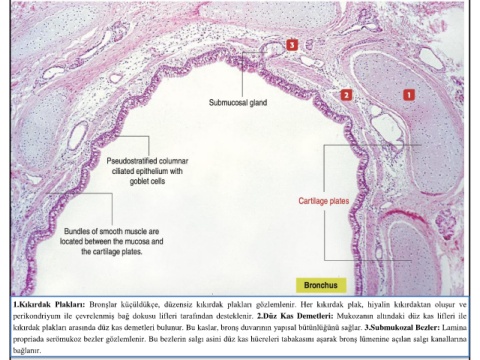 1.Kıkırdak Plakları: Bronşlar küçüldükçe, düzensiz kıkırdak plakları gözlemlenir. Her kıkırdak plak, hiyalin kıkırdaktan oluşur ve