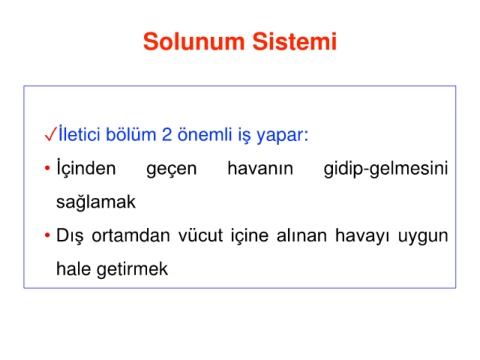 Solunum Sistemi ✓İletici bölüm 2 önemli iş yapar: • İçinden geçen havanın gidip-gelmesini sağlamak • Dış ortamdan vücut içine alınan havayı uygun hale getirmek