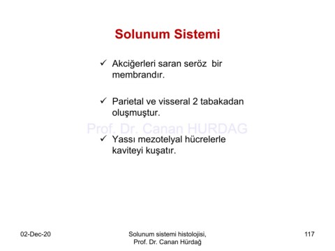 Solunum Sistemi ✓ Akciğerleri saran seröz bir membrandır. ✓ Parietal ve visseral 2 tabakadan oluşmuştur. Prof. Dr. Canan HURDAG ✓ Yassı mezotelyal hücrelerle kaviteyi kuşatır. 02-Dec-20 Solunum sistemi histolojisi, 117 Prof. Dr. Canan Hürdağ