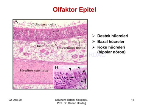 Olfaktor Epitel ➢ Destek hücreleri ➢ Bazal hücreler ➢ Koku hücreleri (bipolar nöron) Prof. Dr. Canan HURDAG 02-Dec-20 Solunum sistemi histolojisi, 18 Prof. Dr. Canan Hürdağ