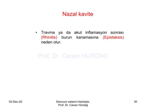 Nazal kavite • Travma ya da akut inflamasyon sonrası (Rhinitis) burun kanamasına (Epistaksis) neden olur. Prof. Dr. Canan HURDAG 02-Dec-20 Solunum sistemi histolojisi, 30 Prof. Dr. Canan Hürdağ