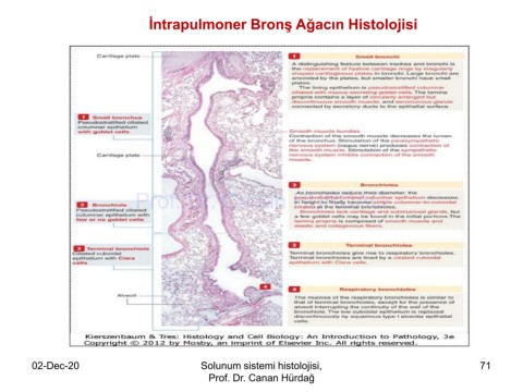 İntrapulmoner Bronş Ağacın Histolojisi Prof. Dr. Canan HURDAG 02-Dec-20 Solunum sistemi histolojisi, 71 Prof. Dr. Canan Hürdağ