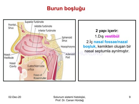 Burun boşluğu 2 yapı içerir: 1.Dış vestibül 2.İç nasal fossae/nazal boşluk, kemikten oluşan bir nasal septumla ayrılmıştır. Prof. Dr. Canan HURDAG 02-Dec-20 Solunum sistemi histolojisi, 9 Prof. Dr. Canan Hürdağ